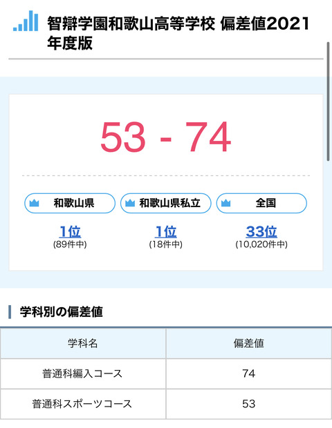 1位 8校 和歌山県私立高校偏差値ランキング. Googleキャッシュ wayback machine 魚拓. 1位 45校 和歌山県高校偏差値ランキング.